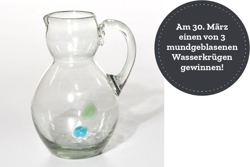 Am 22. März ist Weltwassertag! Für Sei So Frei ein wichtiger Tag im Jahr. Um diesen Tag gebührend zu begehen, verlosen wir unter allen Newsletter-Abonnentinnen und -Abonnenten drei wunderschöne mundgeblasene Wasserkrüge aus Recyclingglas von EZA. Melden Sie sich jetzt zu unserem Newsletter an!
