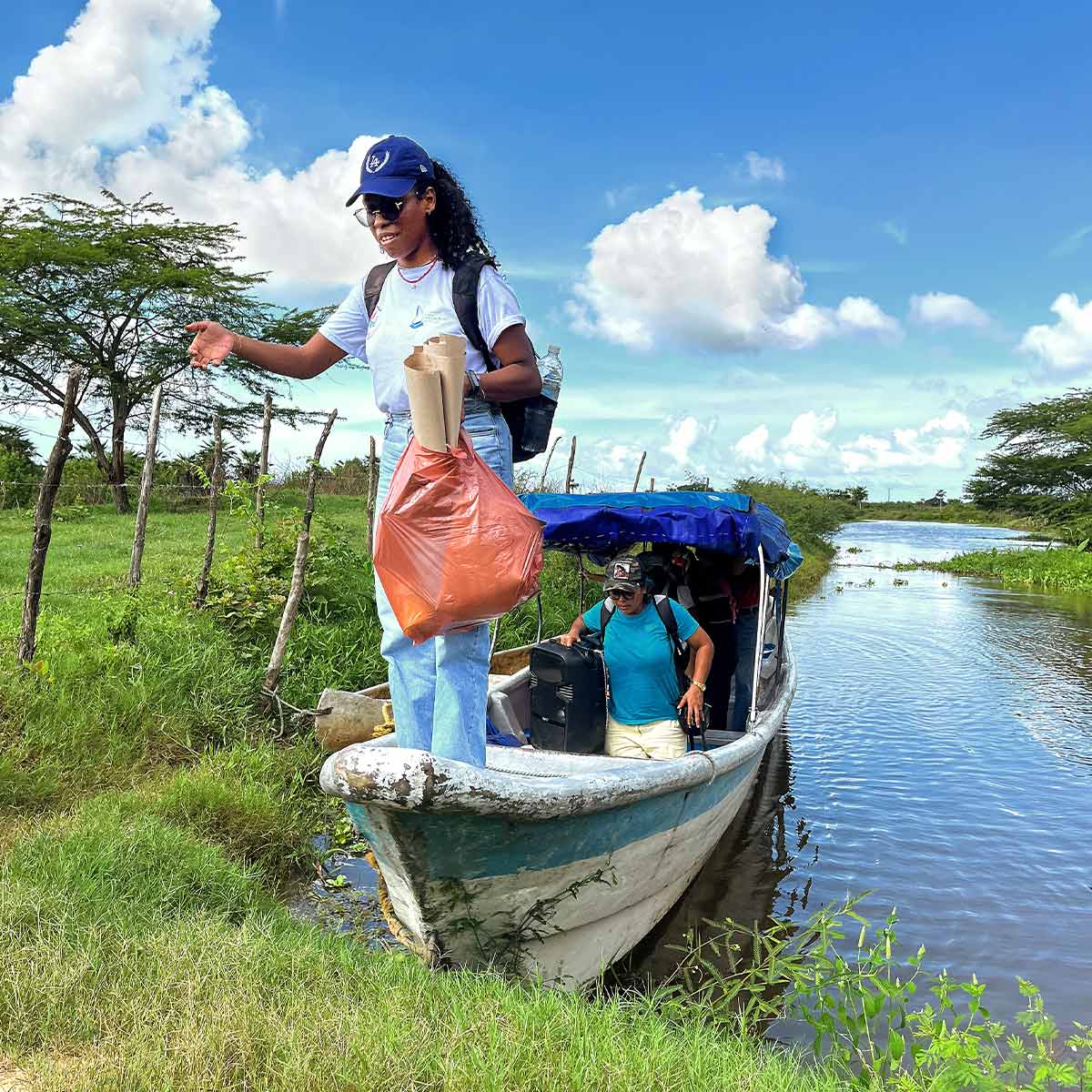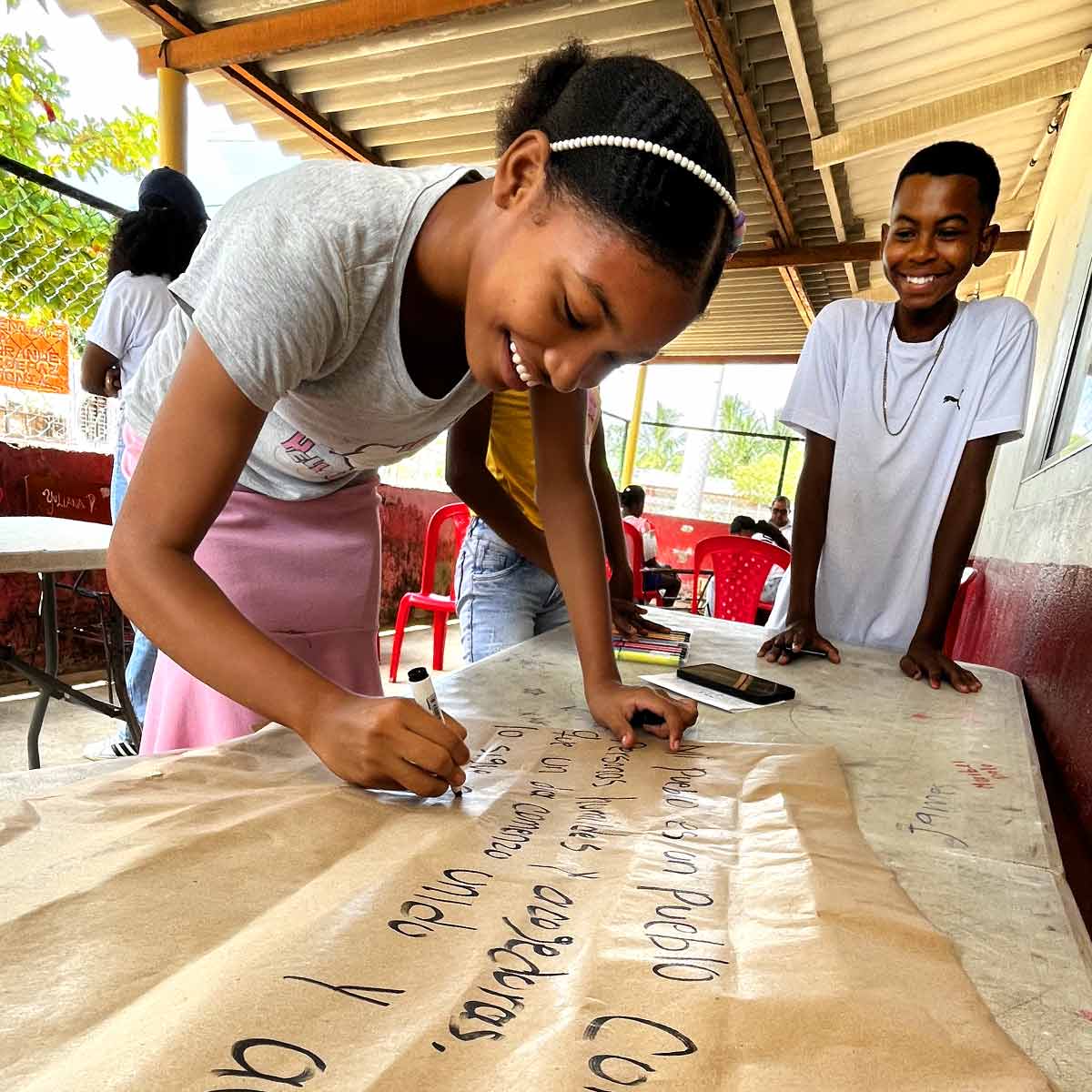 „Es geht um die großen und die kleinen Dinge“, erzählt die 17-jährige Ariana Viloria im Interview. „Unser Lebensraum wird täglich kleiner und verdreckter. Die Industrie bringt unsere Gegend um. Wir haben kaum Aussicht auf Arbeit. Drogenkartelle versuchen manche von uns zu rekrutieren. Wir haben keine Räume, um uns zu treffen und auszutauschen. Wir kämpfen mit alltäglichen Herausforderungen wie verdrecktem Wasser, Müll und fehlendem Gas. Aber auch mit den großen Themen wie Berufsaussichten, unserer eigenen Geschichte, psychischer Gesundheit und vielem mehr.“ Sie und ihre Freundin Yuliana, 15, gehören zu jenen Jugendlichen, die durch unser Projekt erstmals ihre Stimme erheben können. Um diese Stimmen einzufangen, zu sortieren und in Ergebnisse münden zu lassen, sind Sozialarbeiter und Mitarbeiterinnen der Madre Herlinda Moises-Stiftung wie Jenifer Barrios unterwegs. Meist per Boot besuchen sie die Gemeinden der Gegend und koordinieren die Workshops für die Jugendlichen. Wo drückt der Schuh? Was wird benötigt? Was sind die größten Ängste? Das sind die Fragen, die behandelt werden. Mit Flipcharts, Mappen und Stiften ausgestattet, organisieren sie die Stimmen der Jugend.